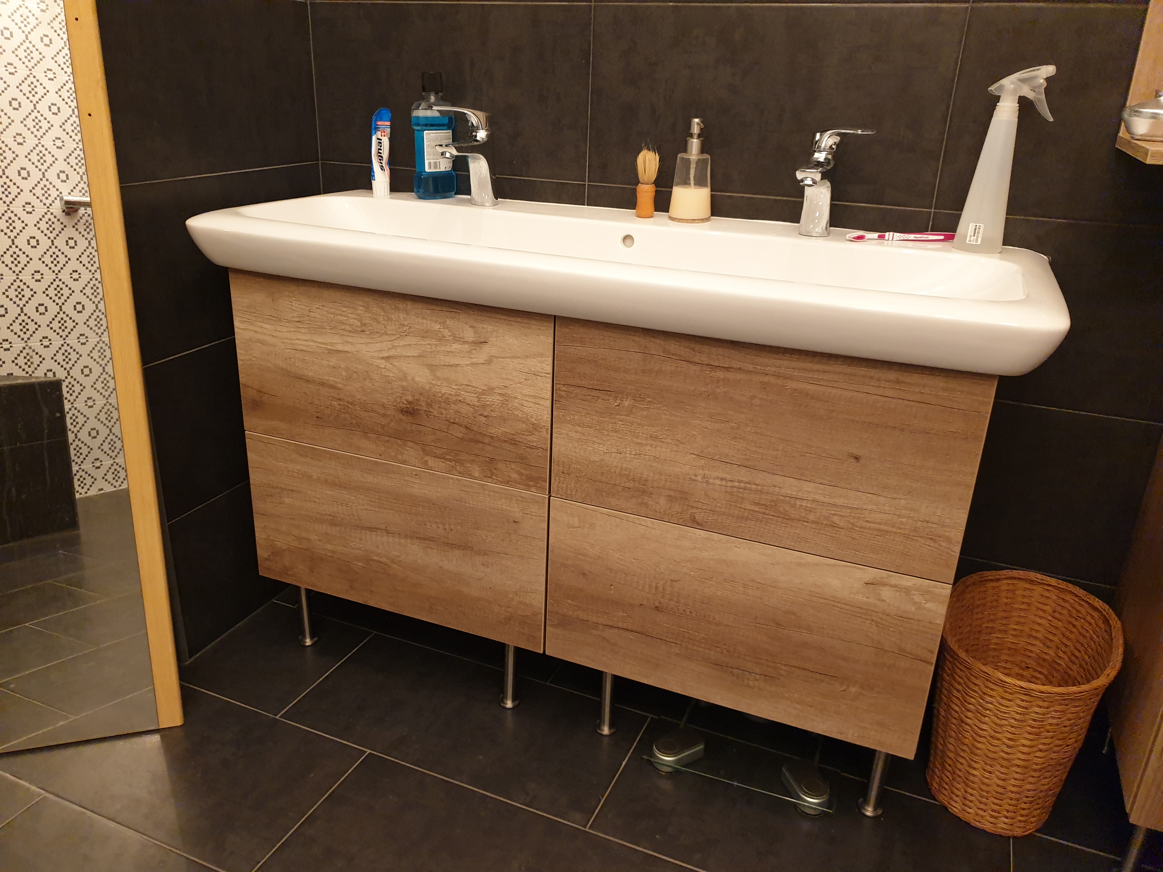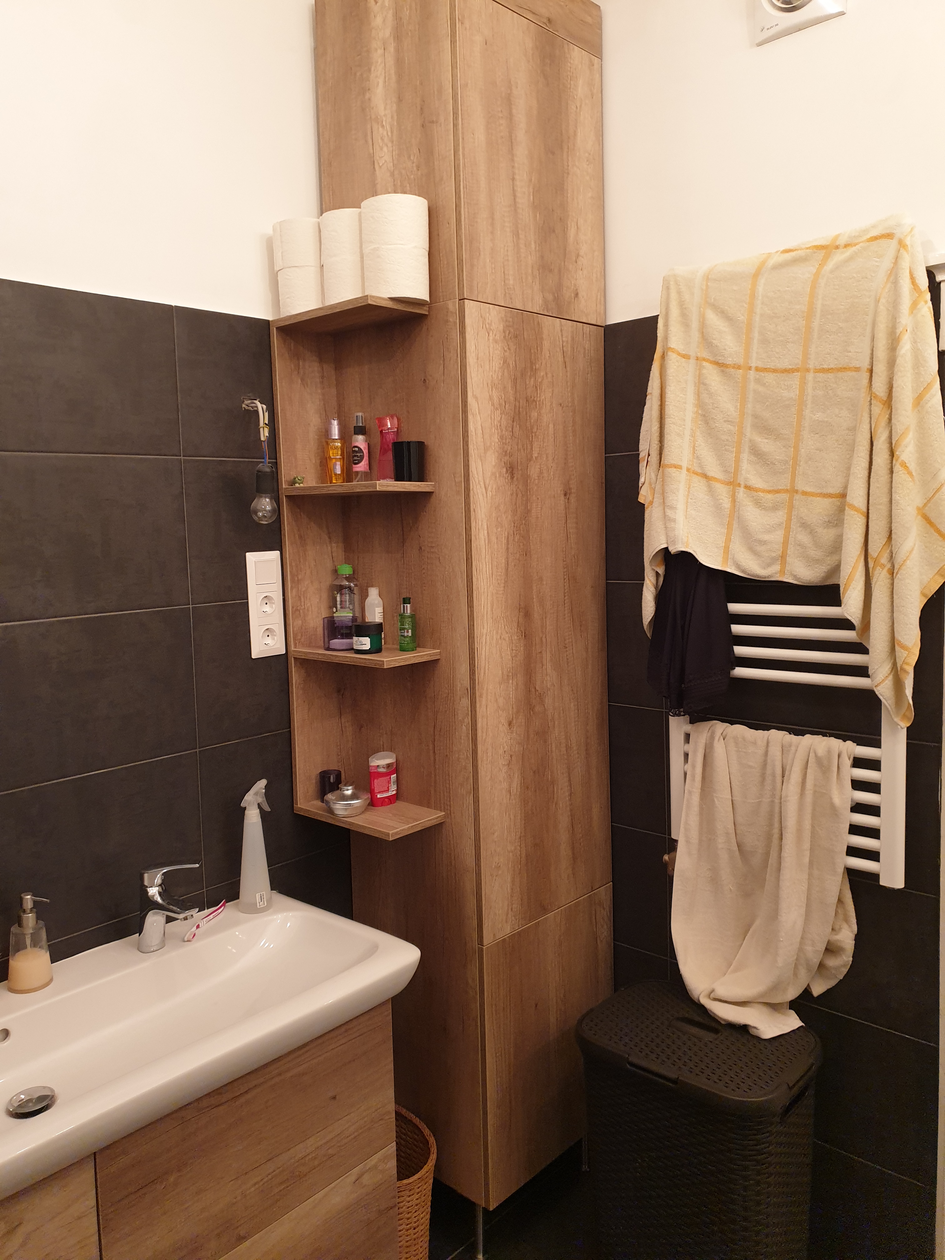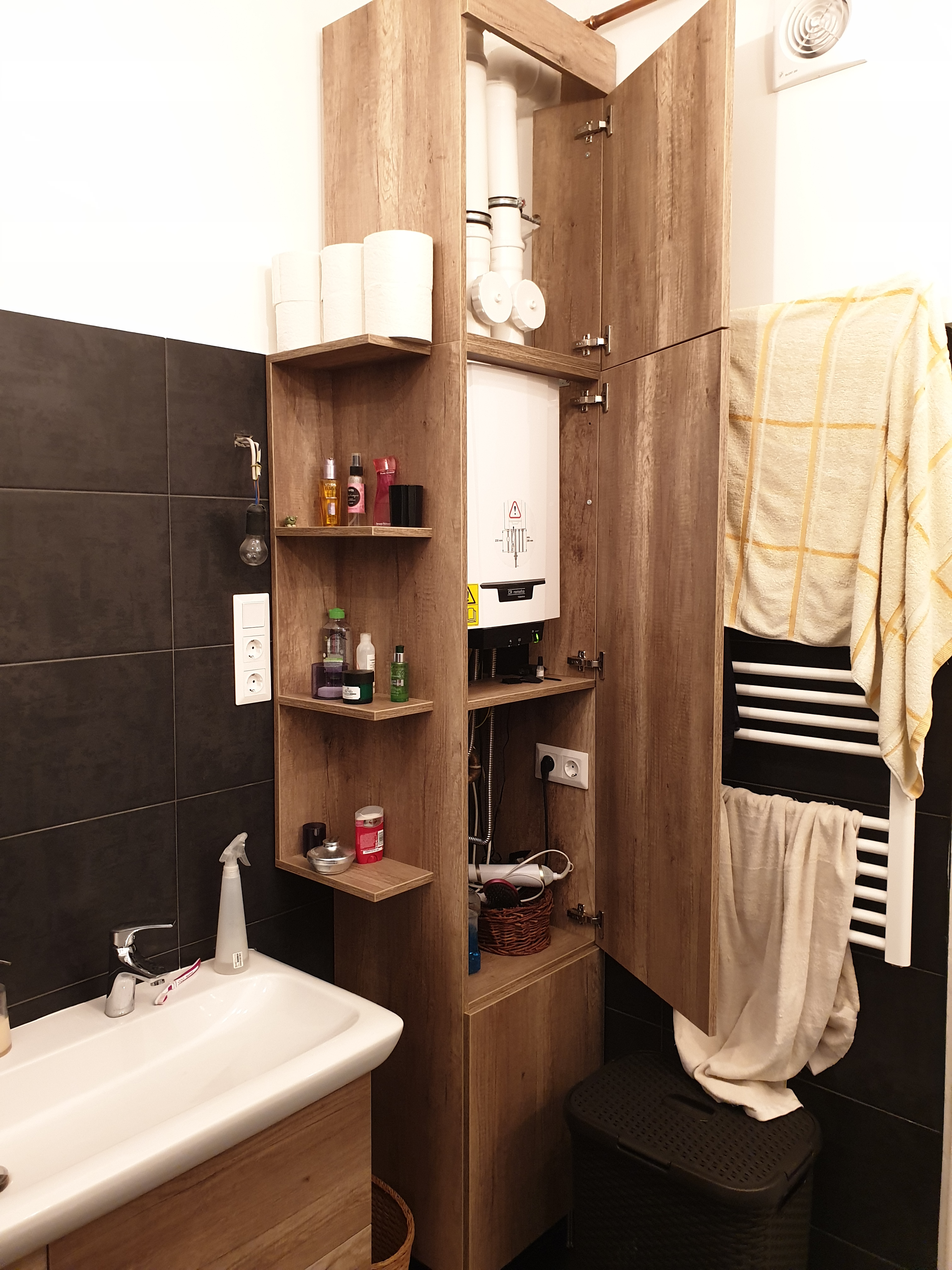 Még ideális csőelrendezés mellett is, nem szívesen nézzük a kazán kilógó elemeit. Főleg, ha padlófűtés is telepítésre került, ami a szokottnál is több gépészettel jár. A mosdó alatti fiókos megoldás ez utóbbit takarja el, míg a kazánt és minden mást a szekrény hivatott elrejteni, miközben sok értékes tároló helyet adnak.