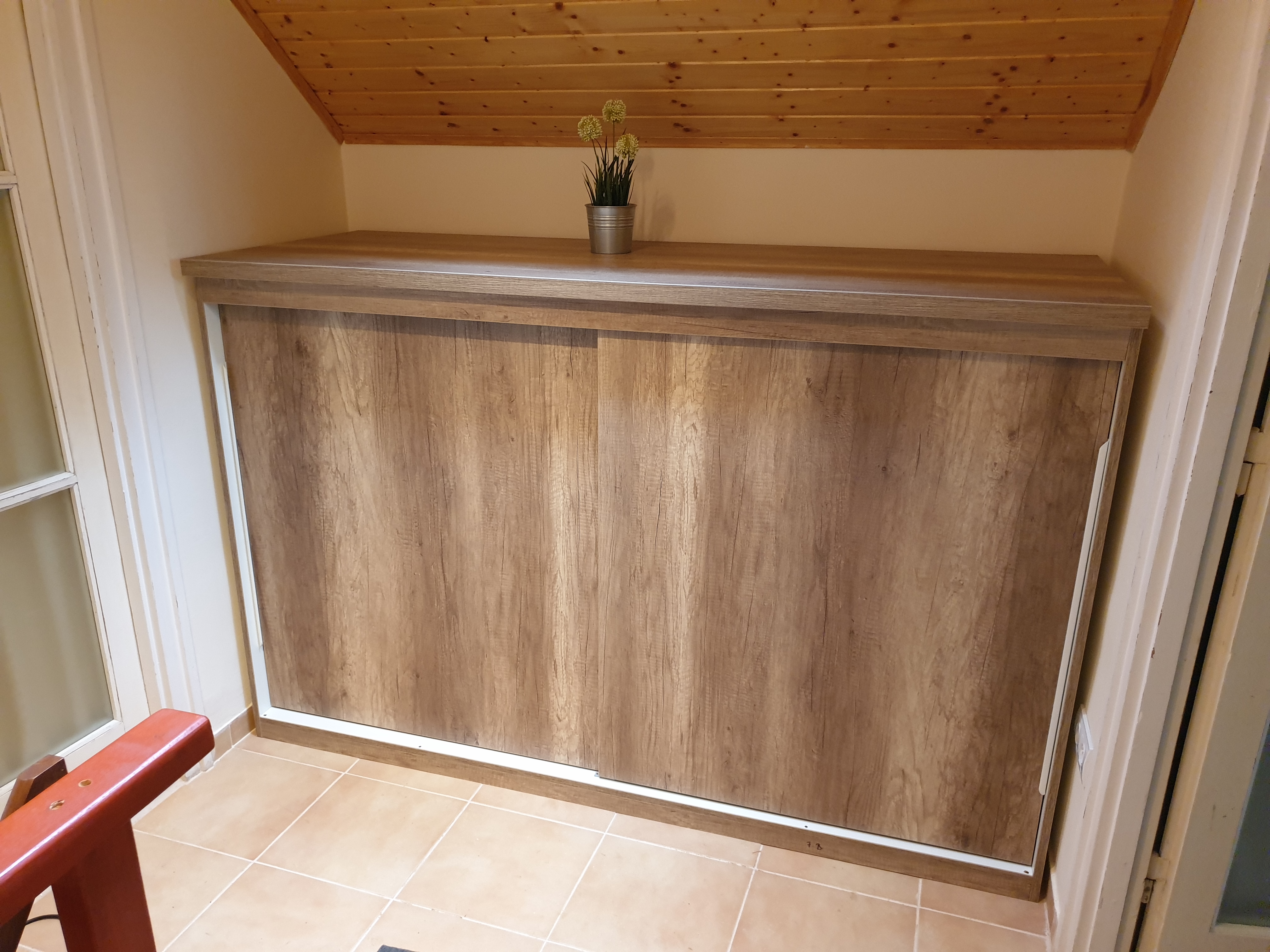 Ha nincs is hely egy teljes értékű gardrób számára, egy öblös, tolóajtós megoldás jó választás lehet más célra is. Itt például egy térdfal mellé, tető alá került beépítésre a bútor.