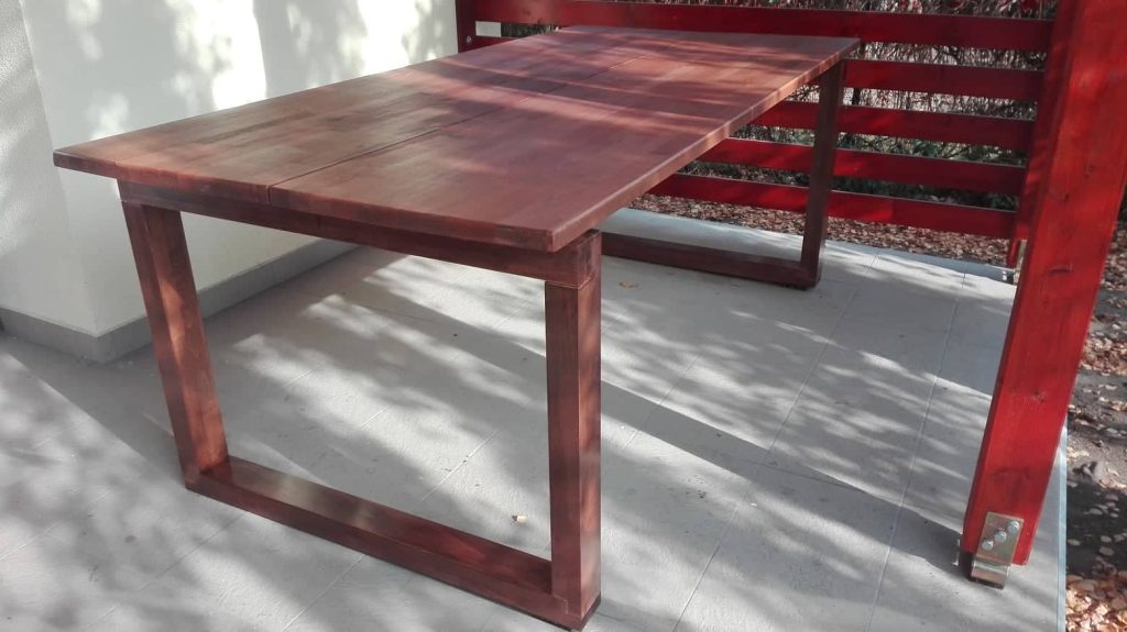 A képen látható asztal a svéd mamut bútorgyár egyik terméke nyomán készült saját igények szerinti méretekkel. Kemény-olajjal kezelve érte el jelenlegi színét, és lett időjárás álló.