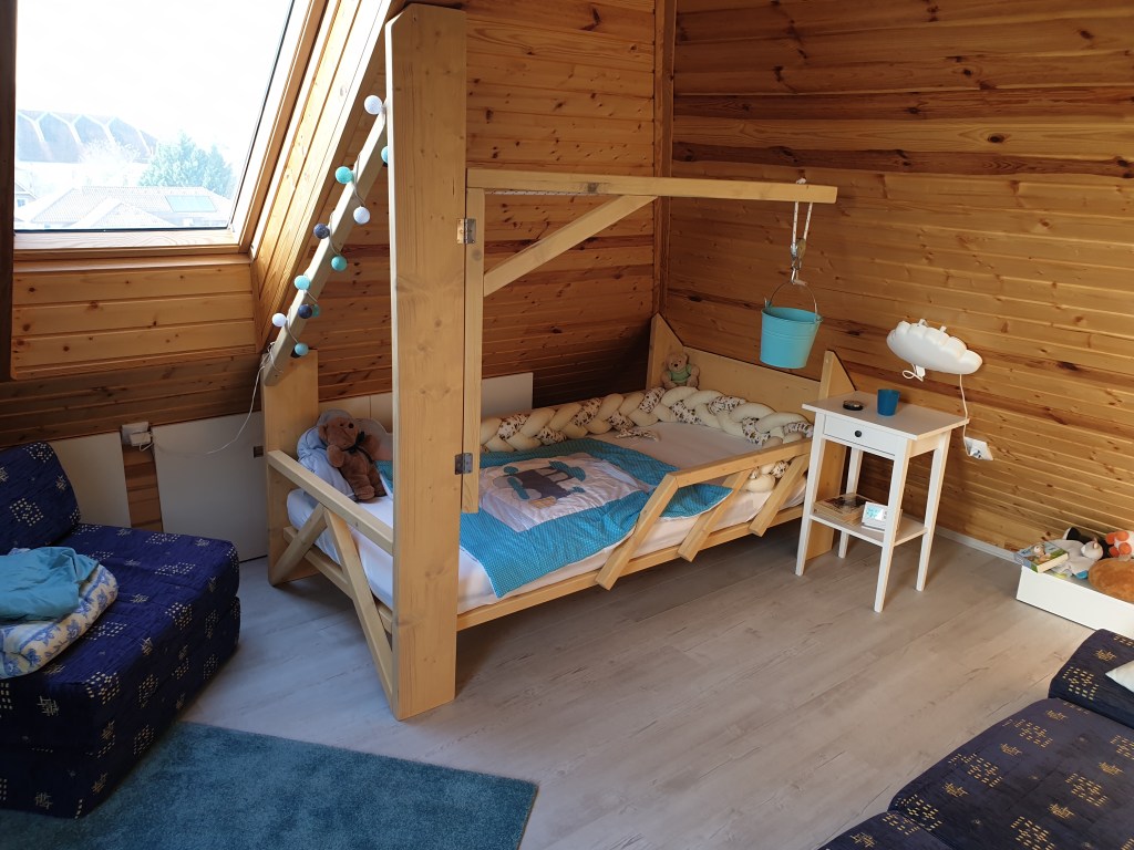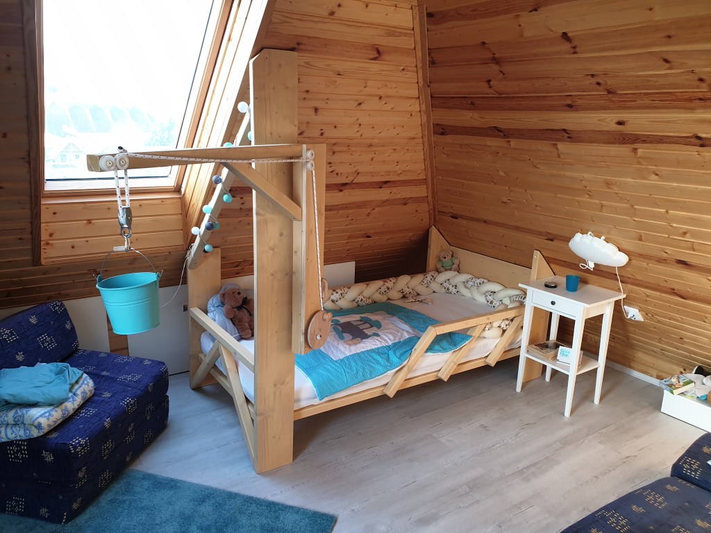 Ha már teljesen szabálytalan helyre kell ágyat építeni, miért ne dobnánk fel azt valamilyen kis játékossággal? Főleg, ha egy kisfiú első nagy ágyáról van szó. A fekhely formailag egy toronydarut idéz. Ha ez nem lenne elég, bele van építve egy ténylegesen működőképes játékdaru, ami könnyű szerrel működtethető a legkisebbek számára is.