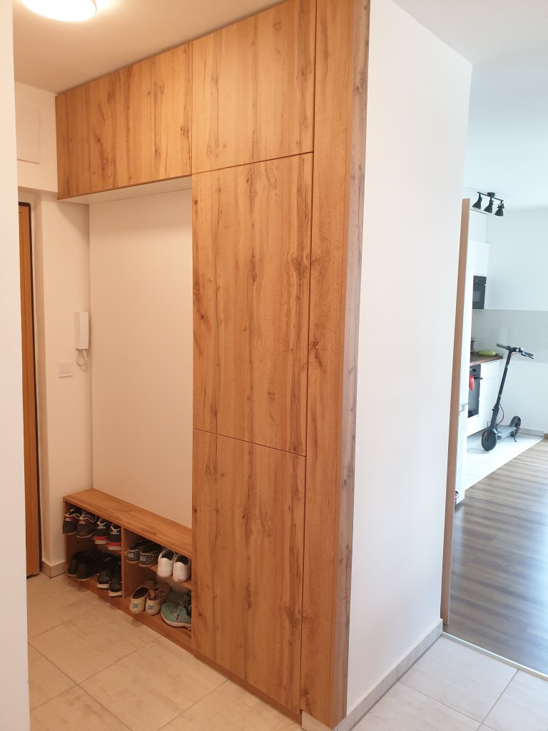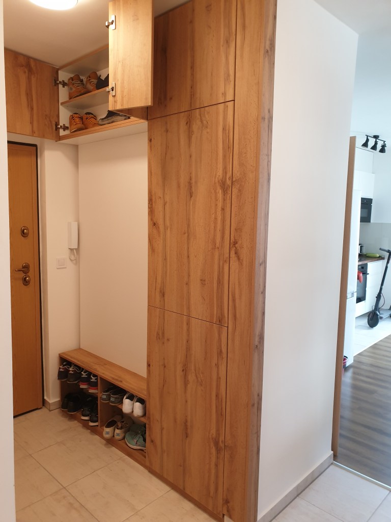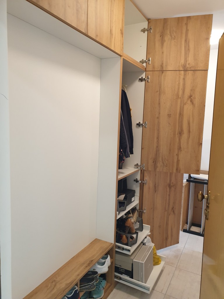 Kétféle mélység jellemezte a következőkben látható előszobát. A cipő tartó részen nagyon kevés hely volt, amolyan fél fenekes ülőkének is éppen hogy csak elég. Mellette viszont majd 70cm-es beugrás, ami simán elnyelt volna egy hűtőt is.
