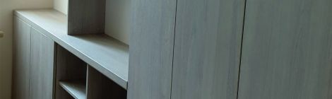 A feladat a fürdőszobából nyíló szauna hátuljának az eltakarása volt az előtérben. Megannyi különböző méretű tárolóhely kialakításával sikerült megvalósítani. A könnyű hozzáférhetőséget tolóajtók biztosítják.