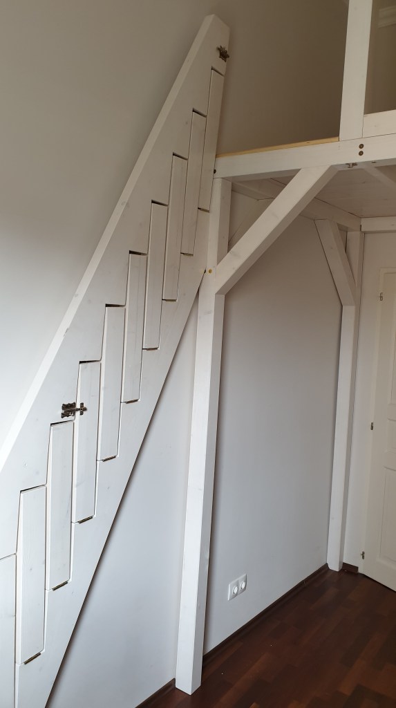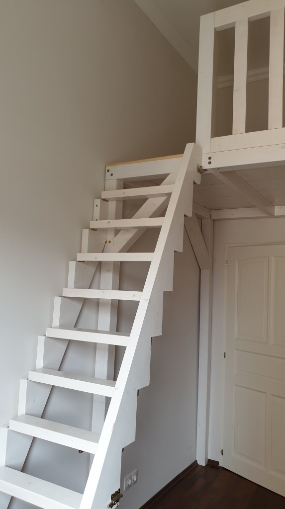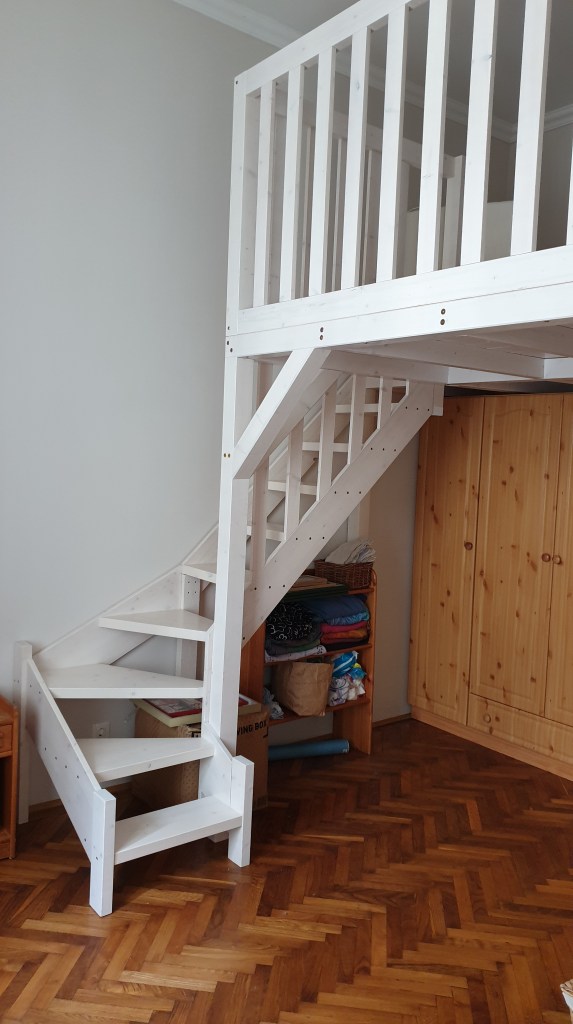 Egy régi, nagy belmagasságú polgári lakásban kerültek megépítésre az alábbi galériák. Fényes fehér lazúrfestékkel kezelt fenyőből készültek, a padlófelület selyemfényű lakkal kezelt hajópadló. A kisebbik galéria kapott egy ma igen divatos falra felhajtható lépcsőt a jobb helykihasználás érdekében, míg a másikra egy fix sarok lépcsőn lehet feljutni.