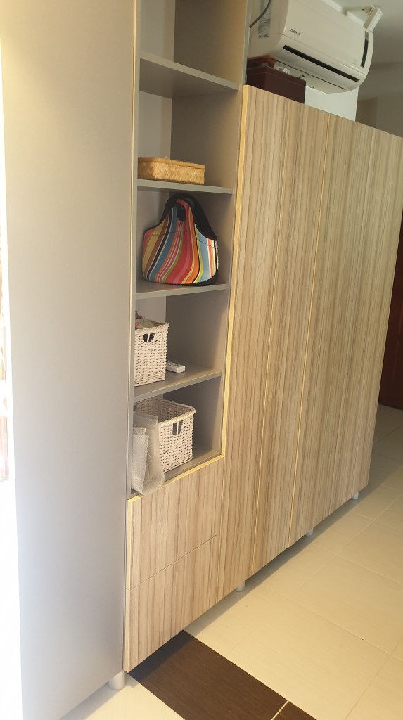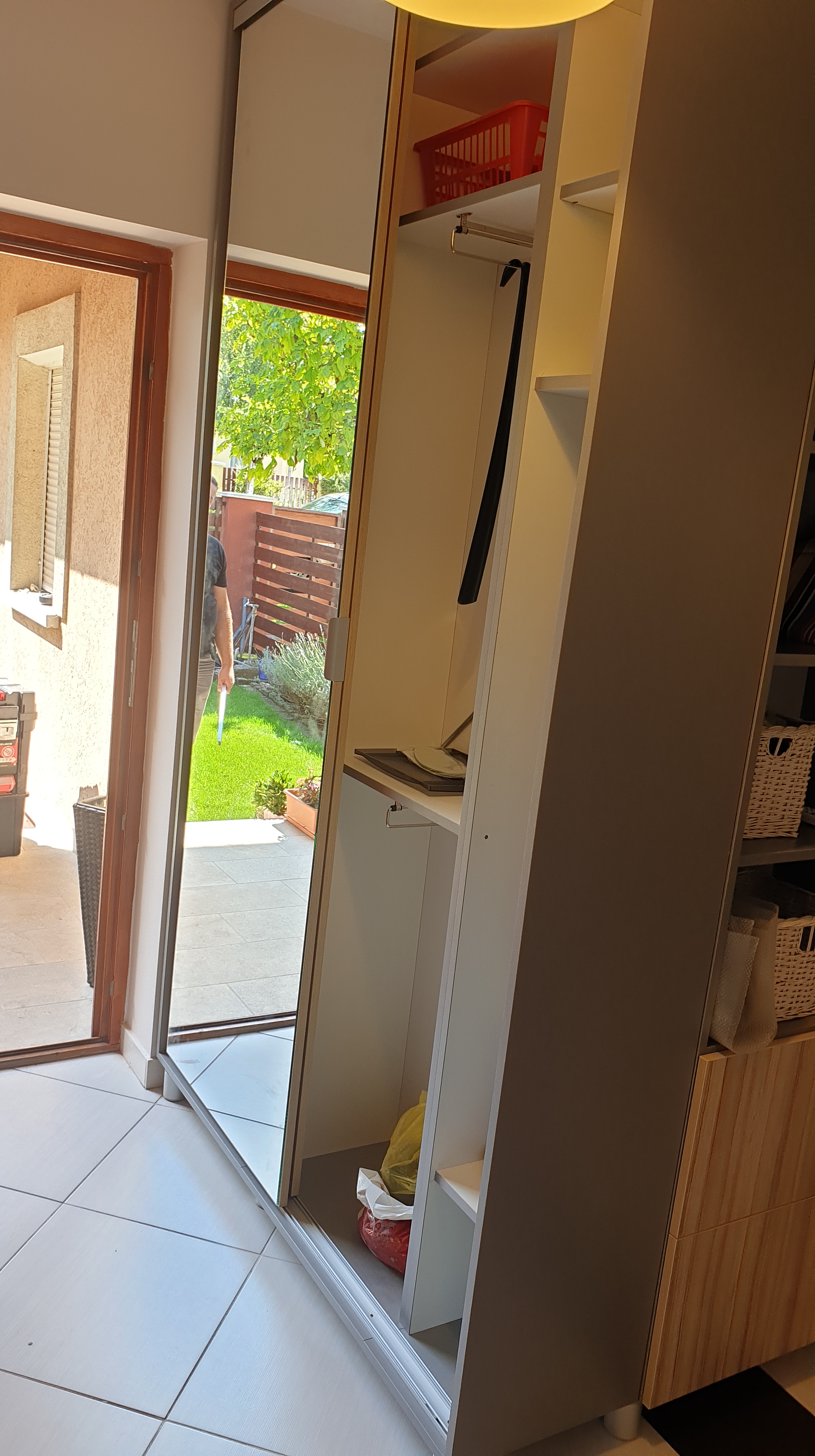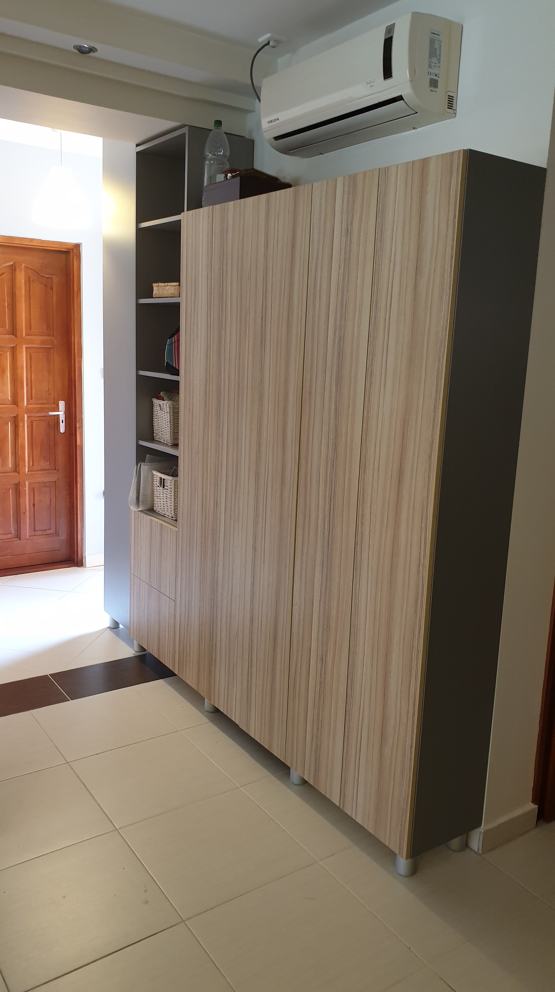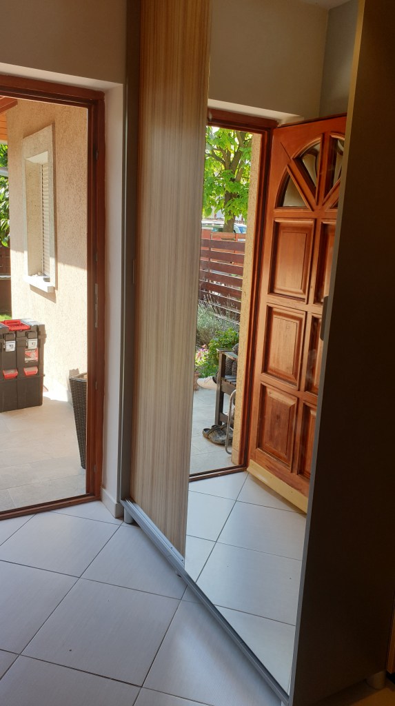 Az alábbi előszoba tervezésénél a cél az volt, hogy a rengeteg tárolóhely mellett esztétikus is legyen. A polcok és ajtós szekrények mellett kialakításra került egy nagy tolóajtós szekrény is, melyben elektromos szerelvényeket is el kellett takarni. Az egyik tolóajtóra egy hatalmas tükör is fel lett ragasztva.