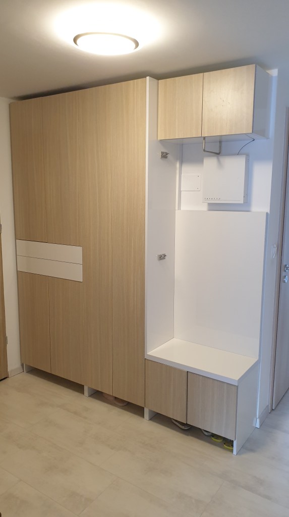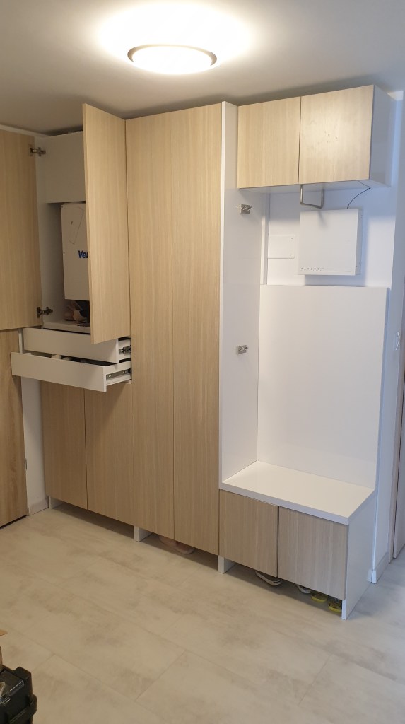 Ez az előszoba szekrény kombináció már ismerős lehet. A kazán eltakarása mellett kialakításra került rengeteg tárolóhely cipőknek, kabátoknak, valamint egy kényelmes kis ülőke is. A riasztó kiugró dobozkáját a kabátok fogják eltakarni egy elegáns akasztó segítségével.
