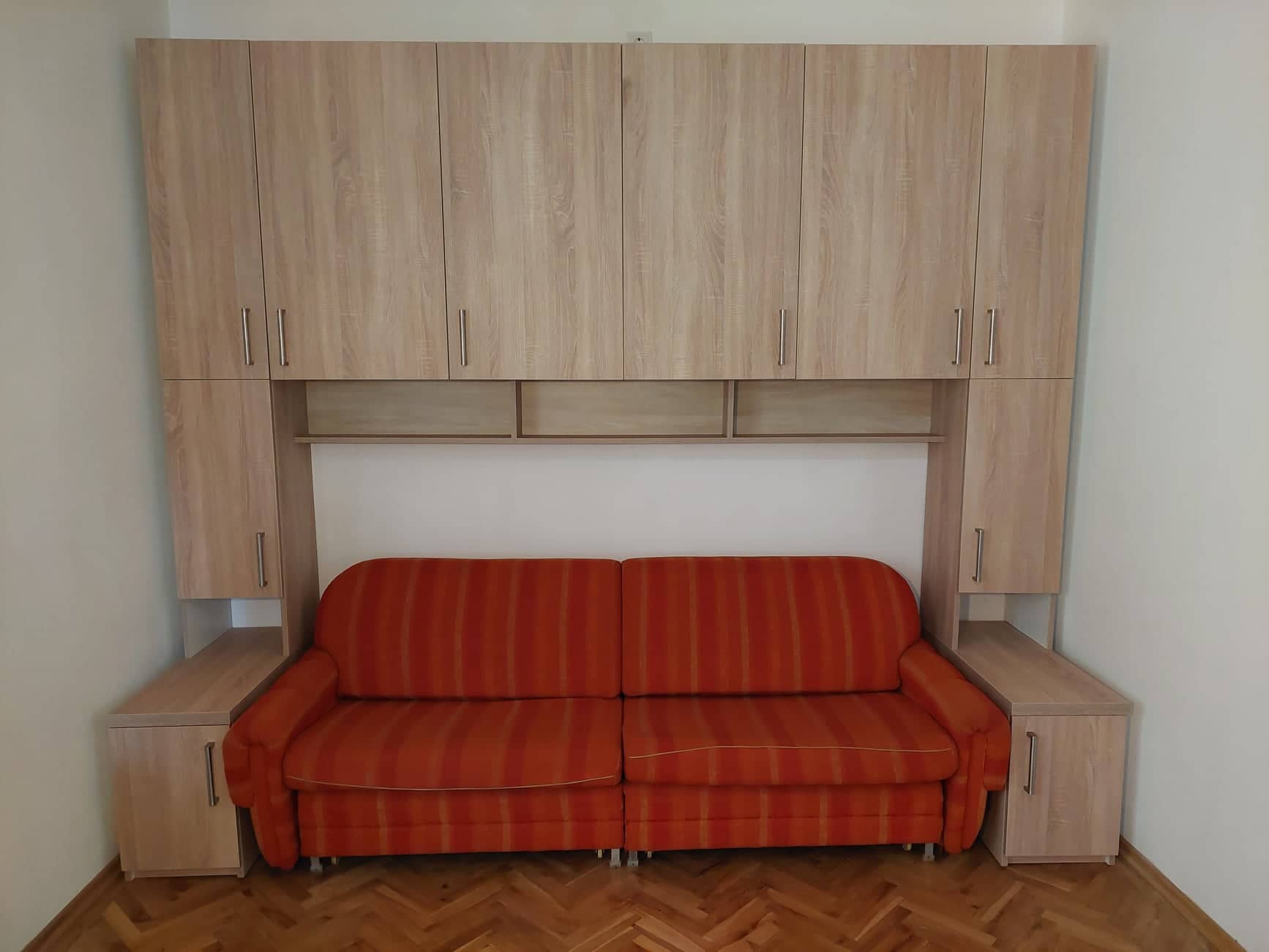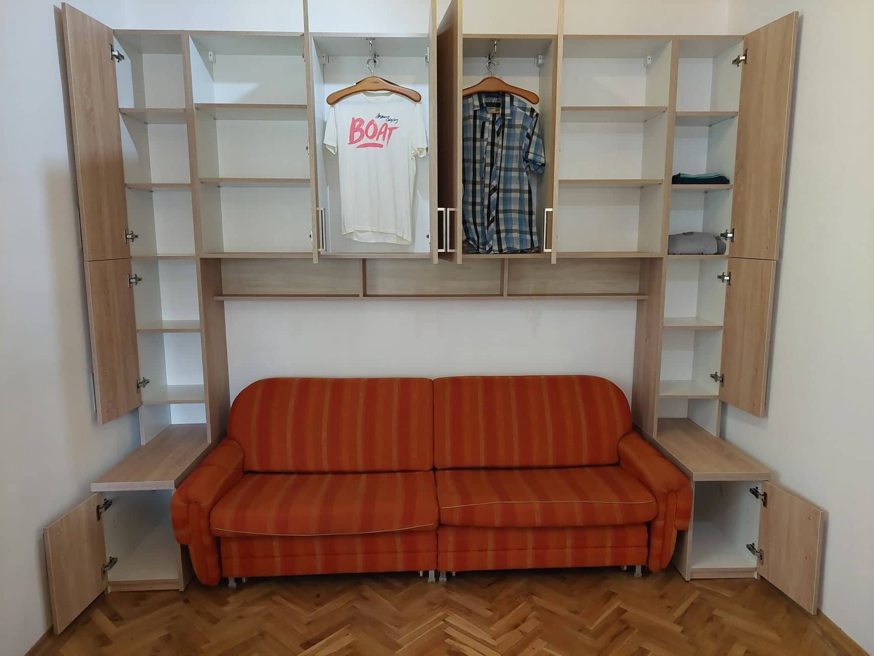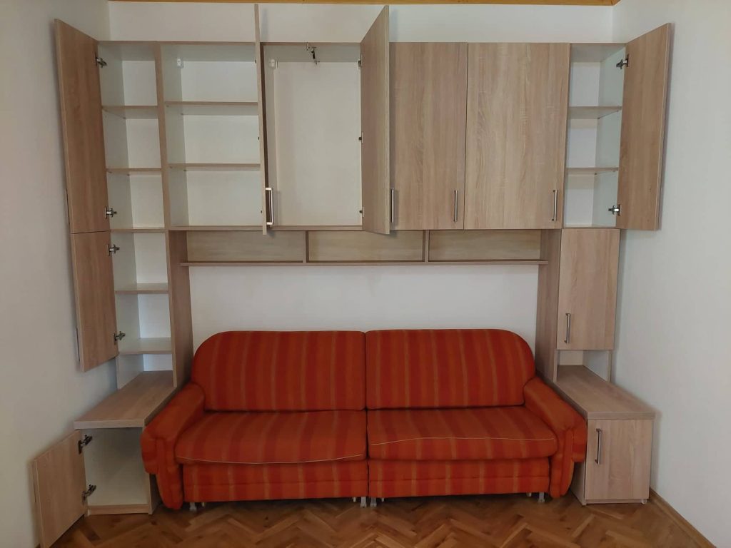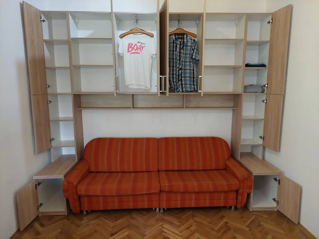 Ez a hálószoba kombináció egy gardróbszekrény és két éjjeli szekrény párosítása. A cél itt is minél több tárolóhely kialakítása volt. A kihúzható fogassal ellátott ruhás és polcos egységek alatt lévő két jelentős mélységű éjjeli szekrény akár ágynemű tárolására is alkalmas.