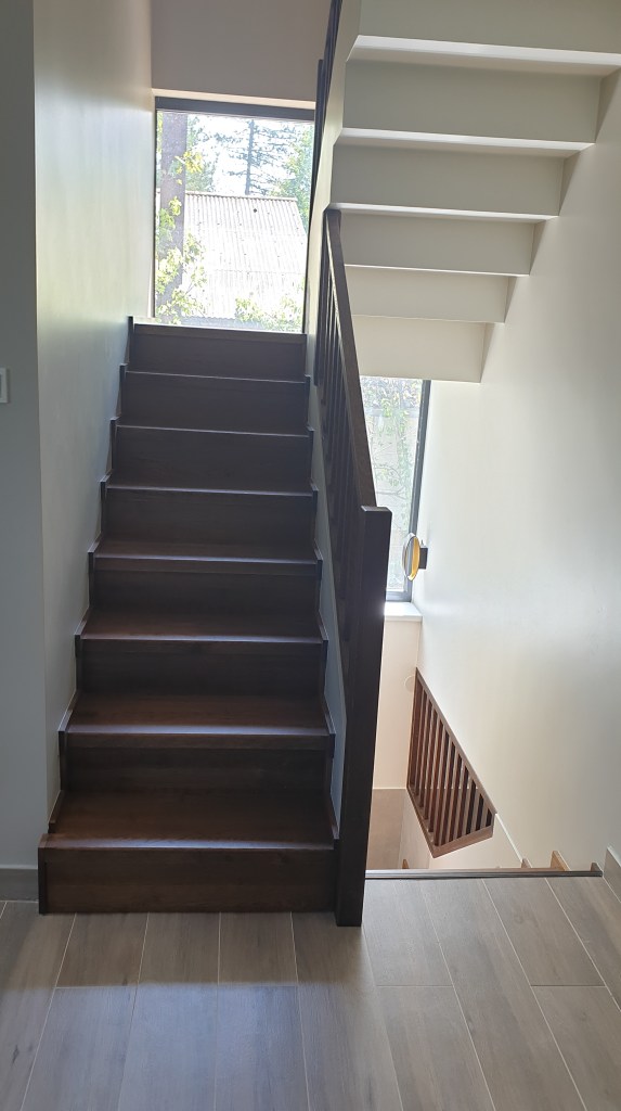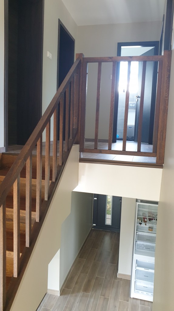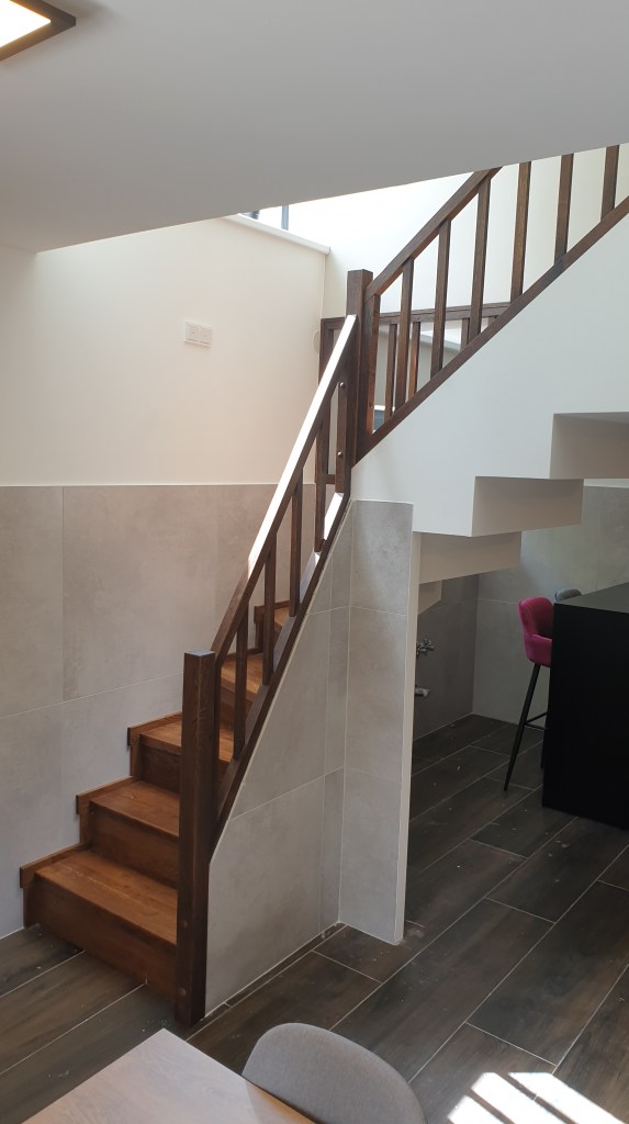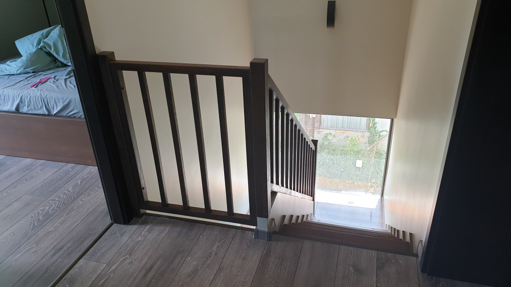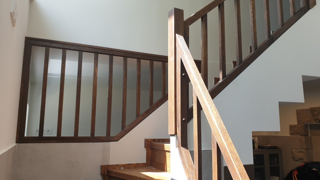 Ez a gyönyörű lépcső egy nyaralóban épült meg. A lépcsőfokok, a forduló, a szegélyek és a korlát is tölgyből készült. A felületek egy növényi olajokból készült termékkel lettek kezelve valamint a minél jobb kopásállóság érdekében a lépcsőfokok lakk réteget is kaptak. A lépcsőfokok ragasztva vannak és a korlát is úgy épült meg, hogy nem látszanak a csavarok.