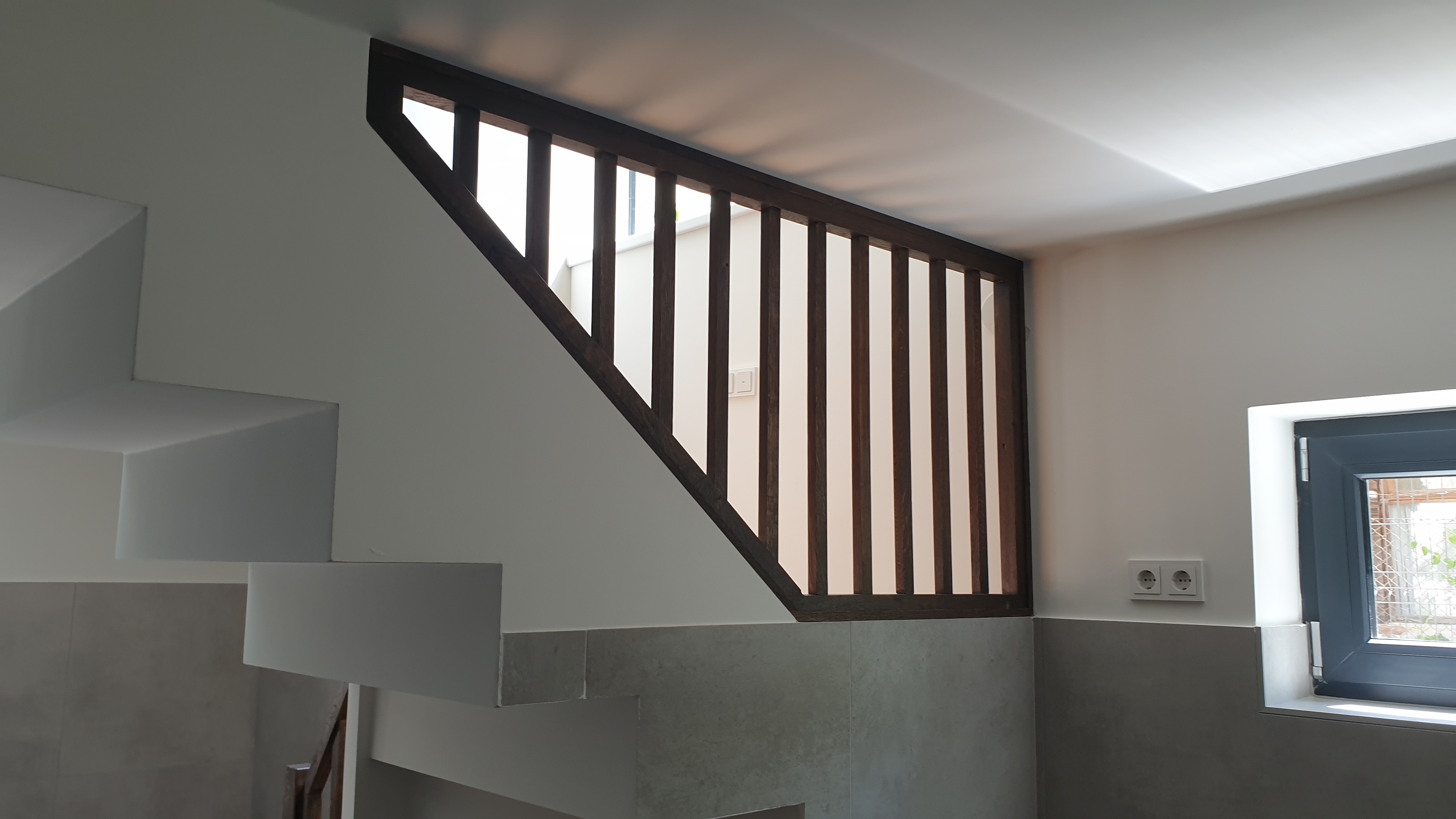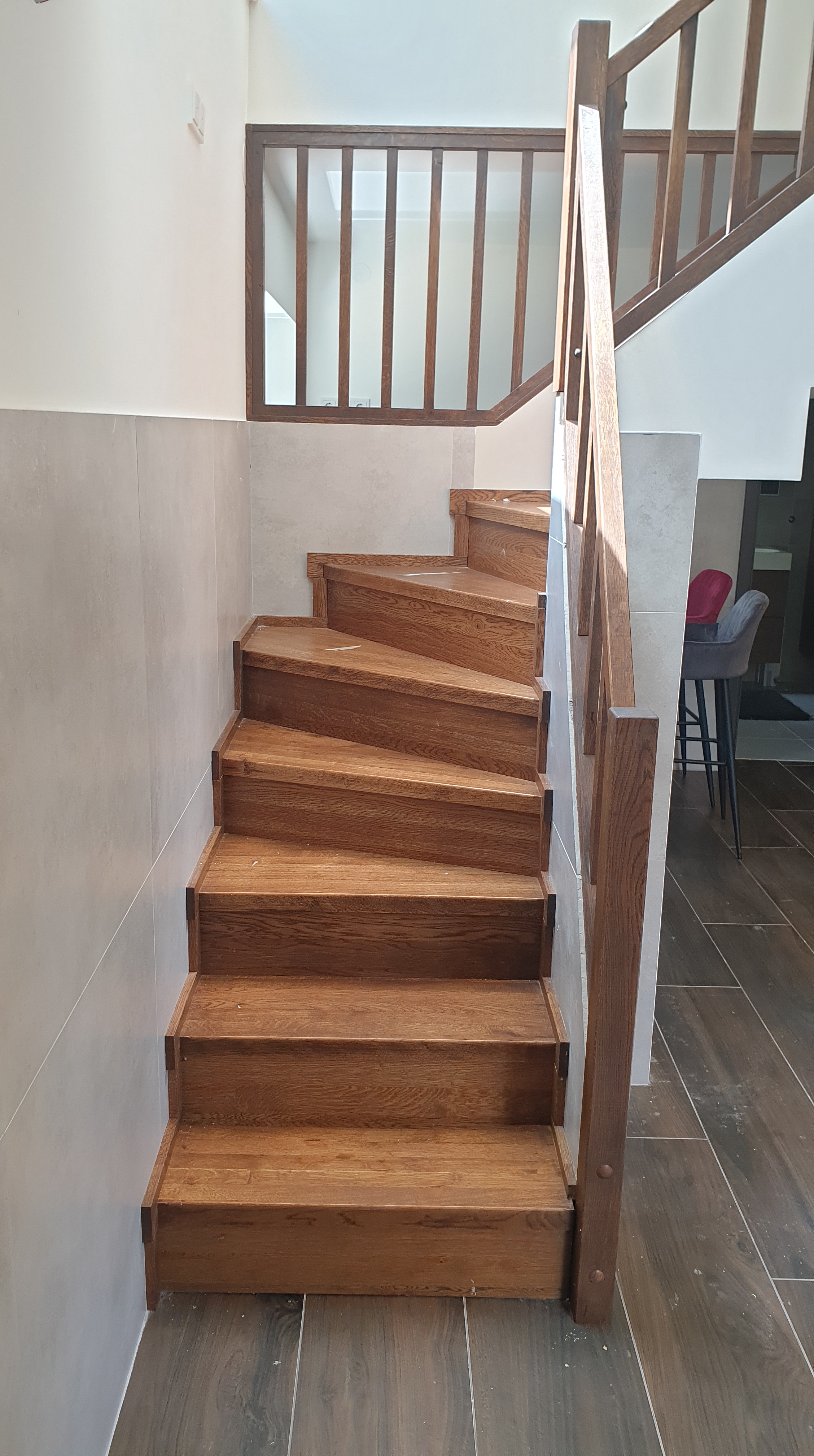 Ez a gyönyörű lépcső egy nyaralóban épült meg. A lépcsőfokok, a forduló, a szegélyek és a korlát is tölgyből készült. A felületek egy növényi olajokból készült termékkel lettek kezelve valamint a minél jobb kopásállóság érdekében a lépcsőfokok lakk réteget is kaptak. A lépcsőfokok ragasztva vannak és a korlát is úgy épült meg, hogy nem látszanak a csavarok.