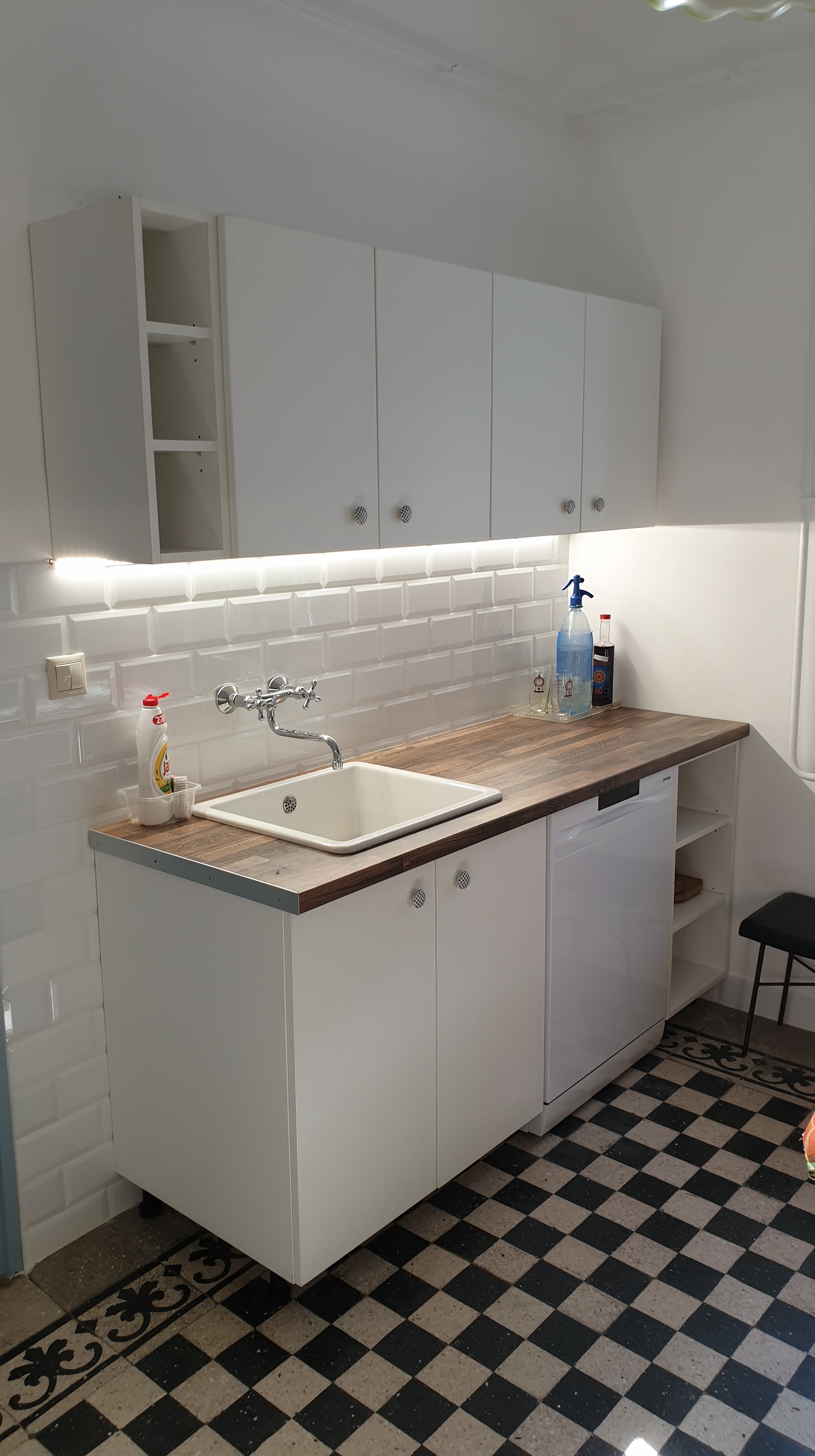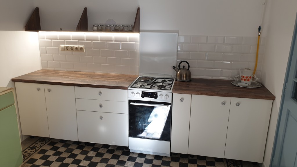 Az alábbi elegáns konyha egy vidéki házban került megépítésre. A korábban meglehetősen kevés tárolóhely most jelentősen megnövekedett. Kerámia mosogatótálca, rejtett akasztós polc és egyedi fogantyúk kerültek felszerelésre. Mindkét oldalon a fényt sarokprofilba szerelt led csík biztosítja.