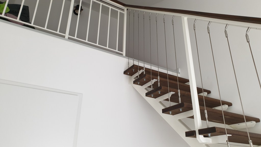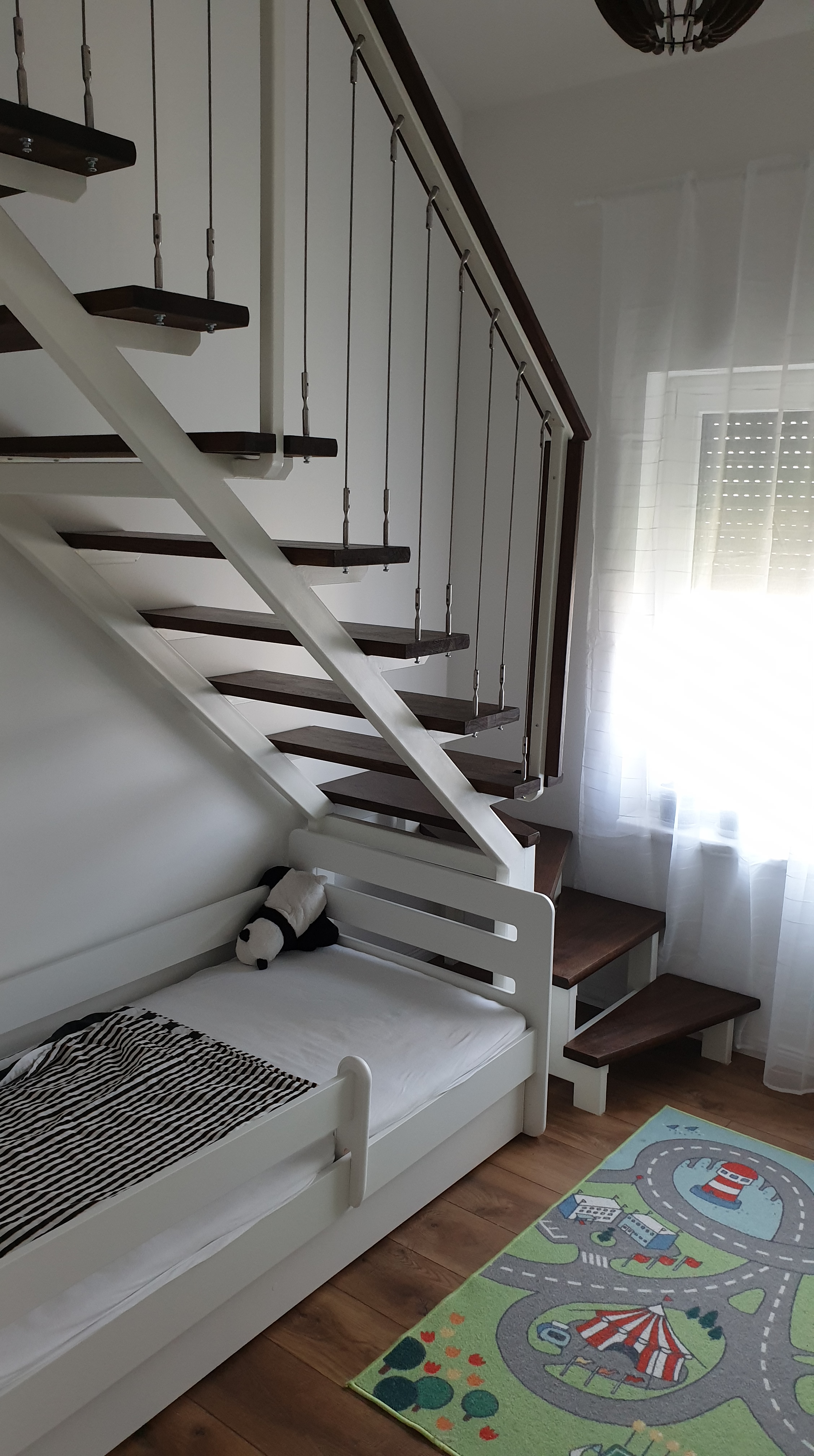 Az alábbi lépcső két egyforma gyerekszobában is meg lett építve. Felvezet egy tetőtéri részbe ahol tárolásra, játékra és alvásra is lehetőség nyílik. A lépcsőfokok és a kapaszkodó is tölgyből készült. A felületek egy növényi olajokból készült termékkel valamint lakkal lettek kezelve. A korlát acél sodronyból lett kialakítva így biztonságos és esztétikus is.
