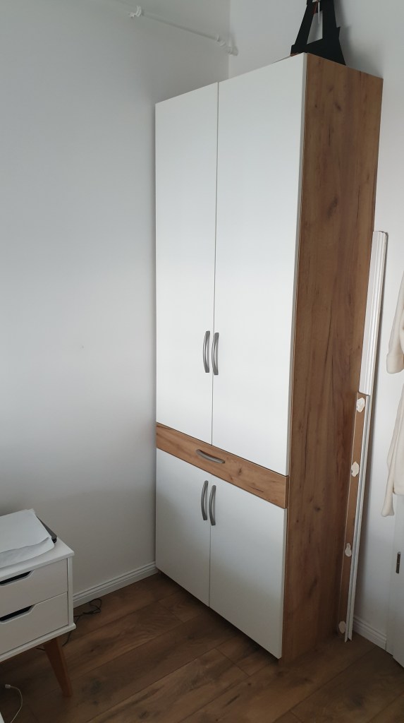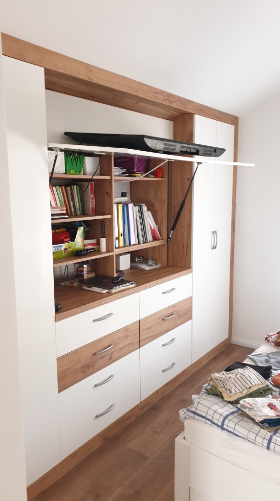 Ez a bútor egy tetőtéri szobában lett megépítve. Jó sok a tárolóhely, köszönhetően a fiókos és az akasztós részeknek. Különlegessége a felhajtható tévé, mely mögött még több holmi elhelyezésére nyílik lehetőség. A szoba kapott még egy álló szekrényt is melyből igény szerint egy kis asztalkát lehet előhúzni.