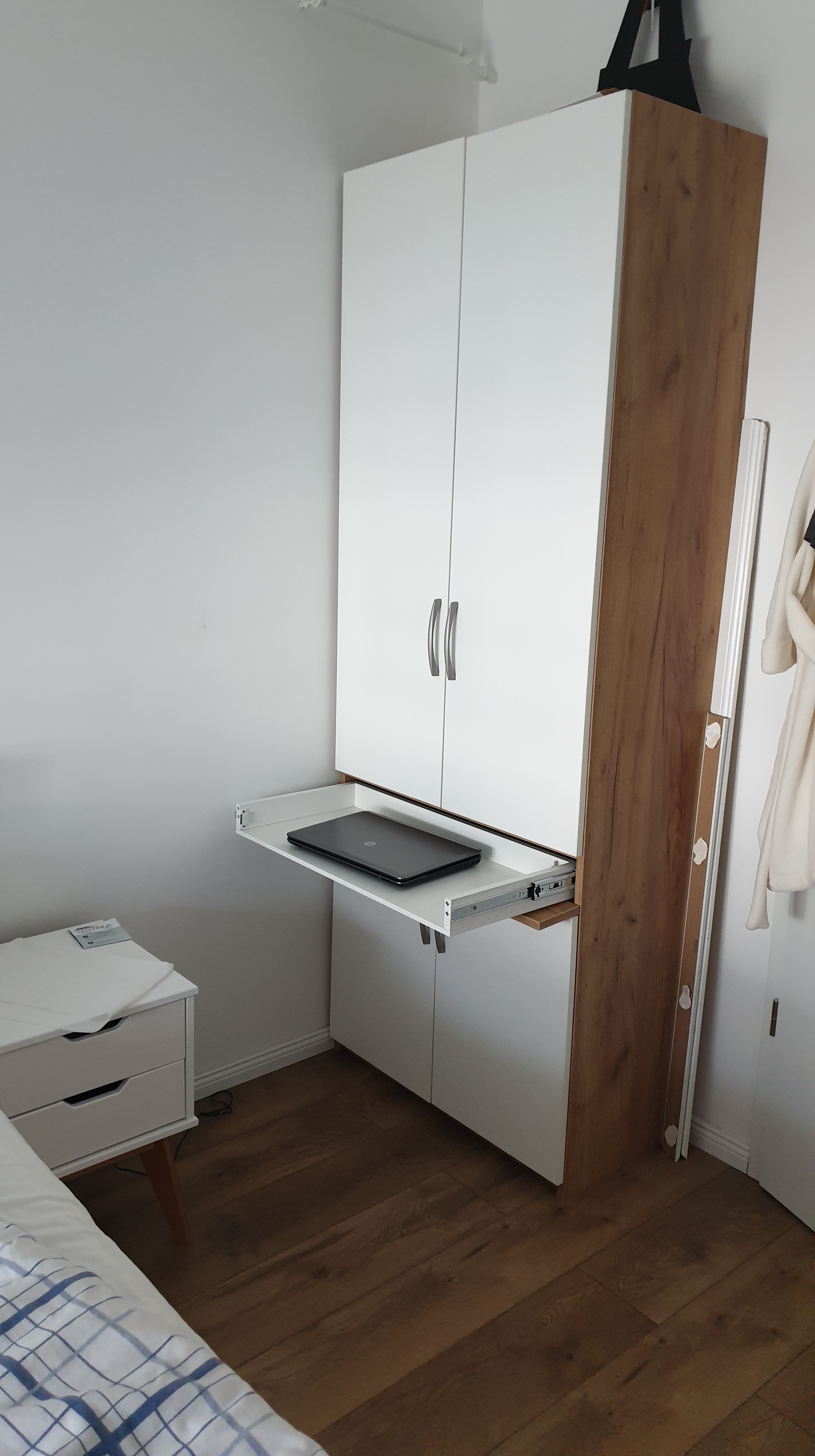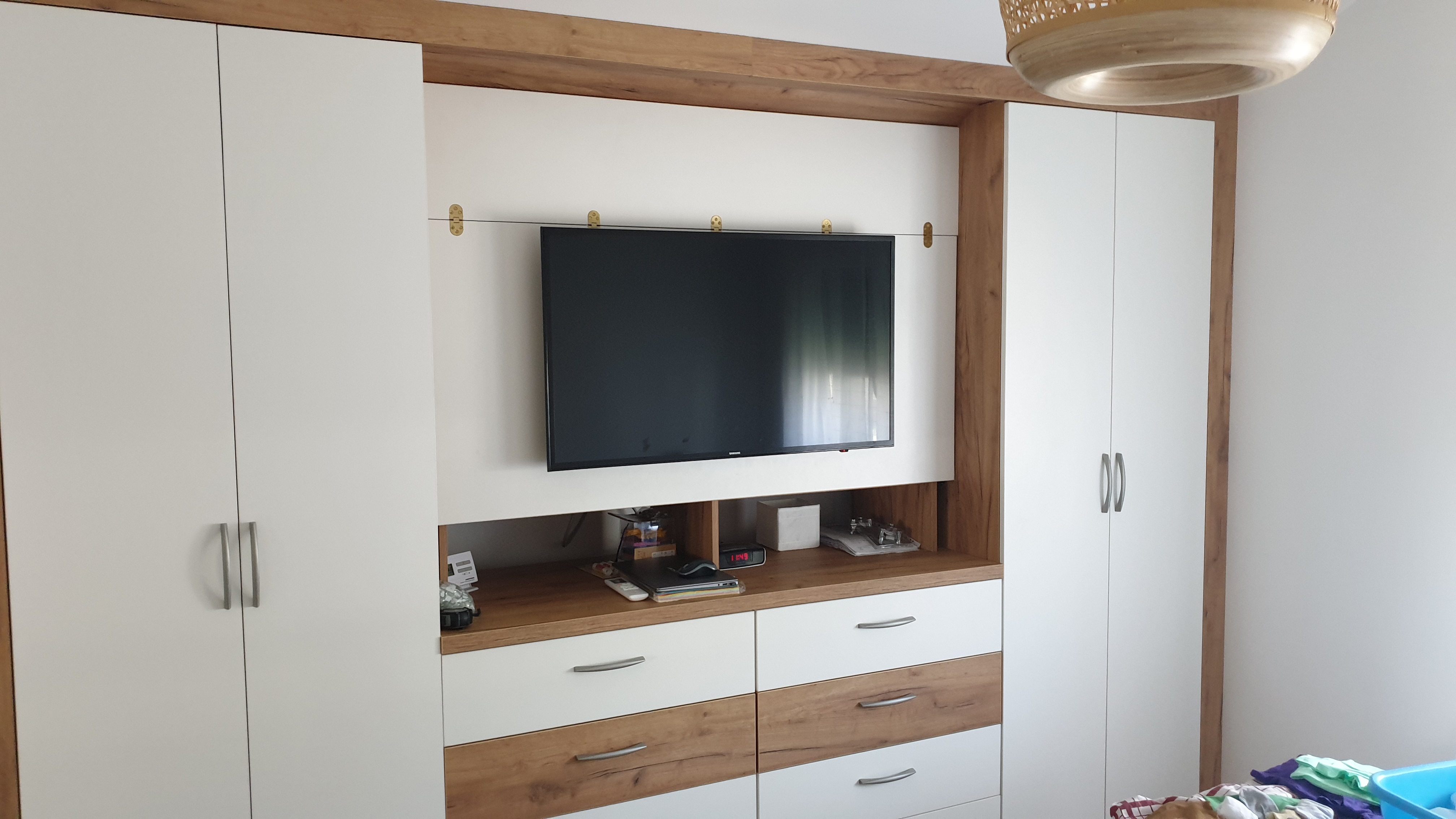 Ez a bútor egy tetőtéri szobában lett megépítve. Jó sok a tárolóhely, köszönhetően a fiókos és az akasztós részeknek. Különlegessége a felhajtható tévé, mely mögött még több holmi elhelyezésére nyílik lehetőség. A szoba kapott még egy álló szekrényt is melyből igény szerint egy kis asztalkát lehet előhúzni.