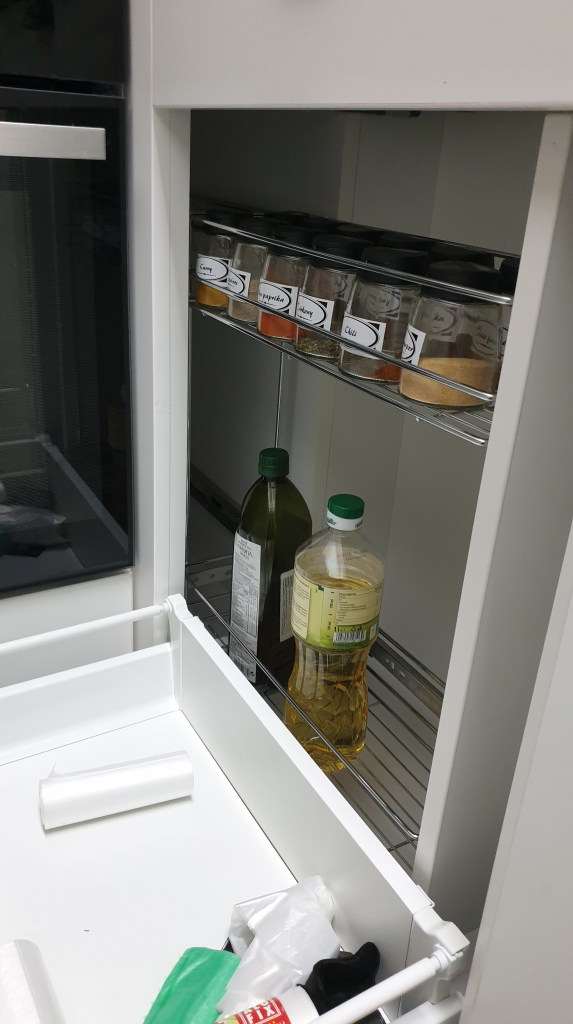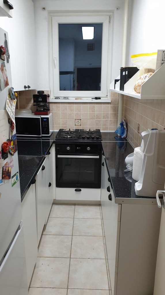 Ez a konyha egy kis méretű lakótelepi helyiségben lett megépítve úgy, hogy még a hűtőnek is helyet kellett szorítani. A legjobb helykihasználás érdekében a sarkokban rejtett fiókok kerültek beépítésre, hogy a lehető legtöbb lehetőség álljon rendelkezésre a konyhai eszközök elhelyezésére. A picike konyhában még egy mosogatógép is helyet kapott.
