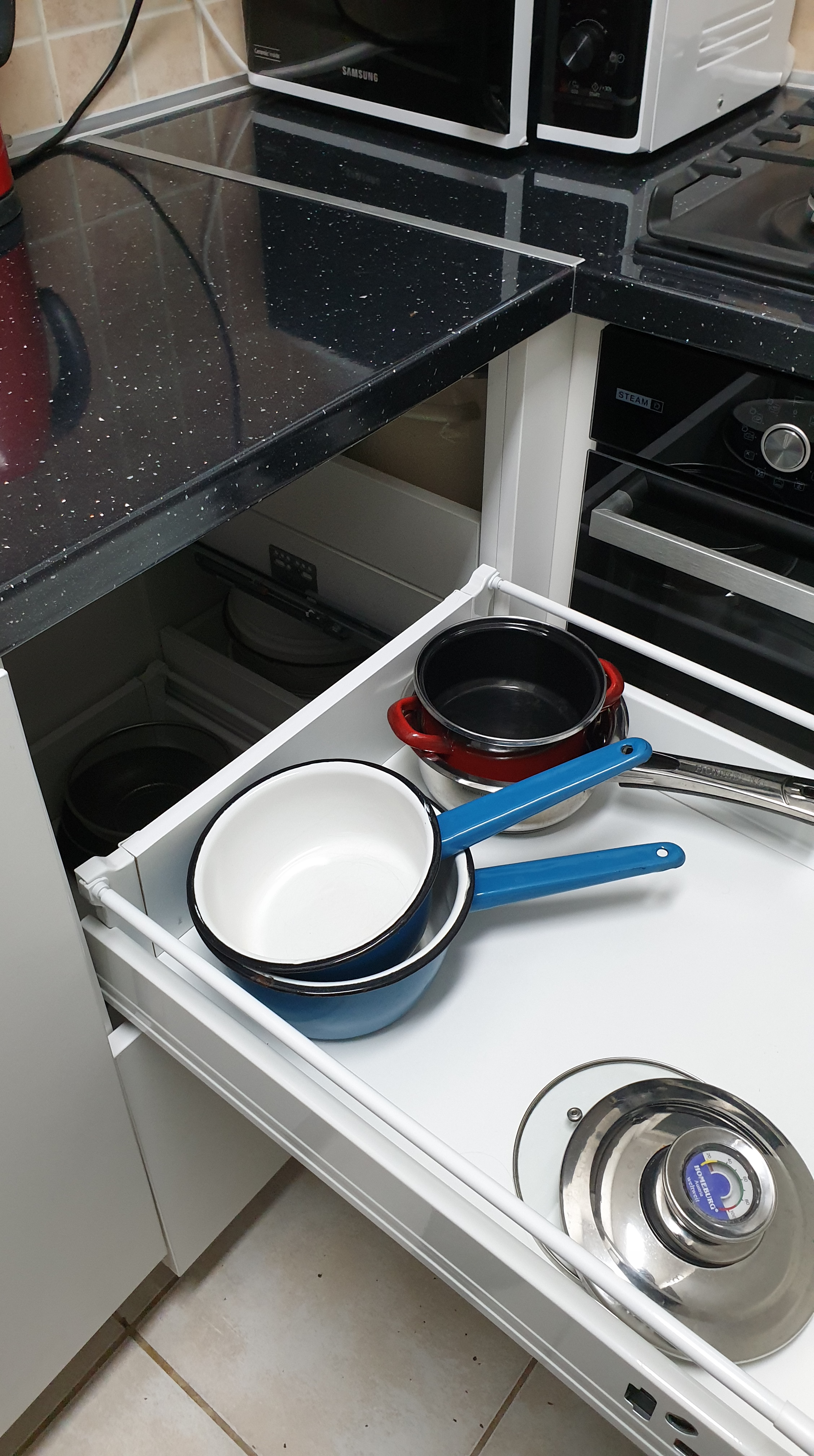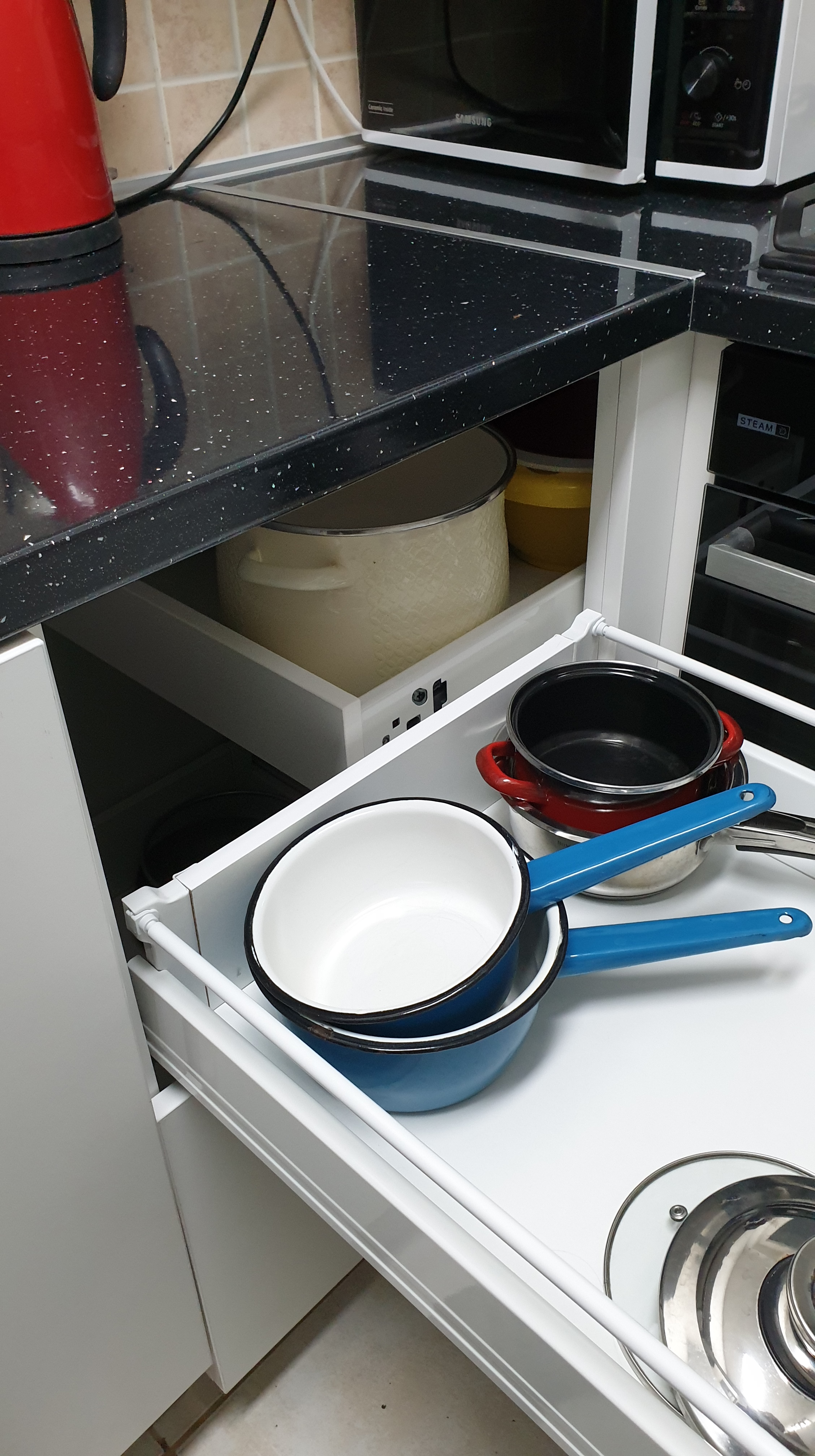 Ez a konyha egy kis méretű lakótelepi helyiségben lett megépítve úgy, hogy még a hűtőnek is helyet kellett szorítani. A legjobb helykihasználás érdekében a sarkokban rejtett fiókok kerültek beépítésre, hogy a lehető legtöbb lehetőség álljon rendelkezésre a konyhai eszközök elhelyezésére. A picike konyhában még egy mosogatógép is helyet kapott.