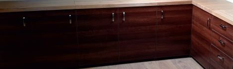 Az alábbi képeken egy otthoni iroda kialakítása látható, egyedi méretek alapján. A tárolóhelyek mellett két nagy asztal is helyet kapott. A sötét színű elemek bútorlapból készültek, a munkafelület selyemfényű lakkal […]