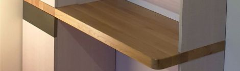 Ez a kis asztalka egy előszoba részét képezi, remek lehetőség mindennapos használatban lévő kisebb tárgyak elhelyezésére. A felszerelt bútorlap a falat hivatott megvédeni. A lap láthatatlan szerelvényekkel került felfüggesztésre.
